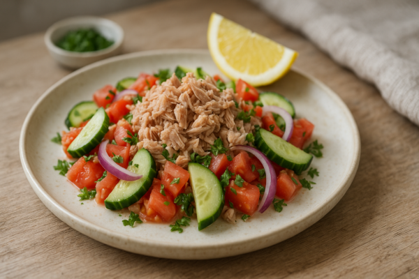 Envie d’un repas frais, sans glucides et prêt en un clin d’œil ? Cette salade thon citronnée associe le croquant des crudités à la richesse en protéines du thon, parfaite pour la phase 2 d’un programme minceur doux. Un plat rassasiant qui allie saveur et légèreté pour soutenir votre démarche bien-être.